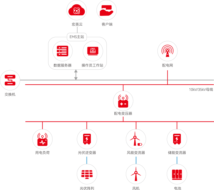 YABO亚博风光储一体化解决方案是融合物联网技术,将风能、太阳能、储能以及EMS能源管理系统结合起来,实现风、光、储多能互补协同运行,能源精准调配减少弃风弃光,提高能源综合效率,同时通过调峰、调频和调相等功能,有效抑制电网波动,提升电网稳定性、可靠性。